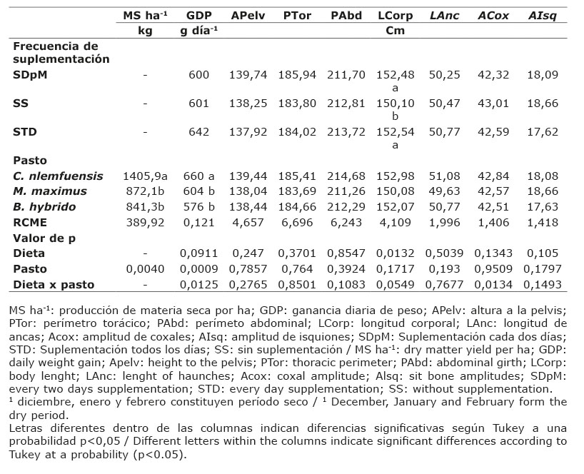 Table 2. Daily weight gain and morphometric measurements of Brahman steers subjected to grazing in grasses of the Cynodon, Megathyrsus, and Brachiaria genera with three frequencies of supplementation. Turipaná Research Centre, Corporación Colombiana de Investigación Agropecuaria (AGROSAVIA). Cereté municipality, Colombia. 2016.