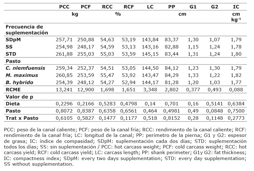 Table 3. Carcass traits of Brahman steers subjected to grazing in grasses of the genera Cynodon, Megathyrsus, and Brachiaria, with three frequencies of supplementation. Turipaná Research Center, Corporación Colombiana de Investigación Agropecuaria (AGROSAVIA). Cereté, municipality, Colombia. 2016.