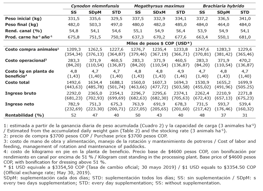 Abstract: Introduction. Beef production is affected by stationarity forage production and fed cost. Feed frequency evaluations according to pasture could suggest an appropriate practice for profitability improvement. Objective. To evaluate technically and economically the frequency of supplementation of Brahman fattening steers in grazing. Materials and methods. In the middle valley of the Sinú river, Colombia, 108 steers were used distributed in a split-plot design into three pastures (Cynodon nlemfuensis, Megathyrsus maximus, and Brachiaria hybrida, main plot) and three supplementation schemes (subplot): daily (STD), every two days (SDpM) and without supplementation (SS). The daily weight gain (GPD) and morphometric characteristics were evaluated in steers. In the carcass: weight, yield, length, leg perimeter, fat thickness, and compactness index. The biophysical data results fed the financial evaluation of the implemented technology. Results. An interaction of pasture and supplementation frequency over daily weight gain was detected (p<0.05). The highest GPD was observed in animals of the STD treatment for the grass C. nlemfuensis (680 g day-1), while a B. hybrida cv Mulato II in SDpM recorded the lowest GPD with 500 g day-1. An effect (p<0.05) of the diet on body length was observed (150 vs. 152 cm for not supplemented and supplemented steers, respectively). There were no differences (p<0.05) between treatments over carcass characteristics. Conclusions. The biological response in GPD did not compensate for the differential operating cost in the supplemented animals. It is necessary to evaluate new diets with raw materials and inclusion levels that contribute to the increase in animal production, to generate a detectable change in the animal and economic response.