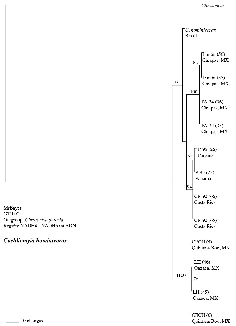 Para los árboles filogenéticos de C. hominivorax se empleó como grupo externo (outgruop) a la especie Chrysomya putoria (Junqueira et al., 2004), debido a que molecularmente es la especie más cercana a C. hominivorax. Las secuencias de C. putoria fueron de la misma región (NADH4, tRNA, NADH5) amplificada para C. hominivorax de Brasil (Lessinger et al., 2000), las cuales fueron obtenidas del GenBank.