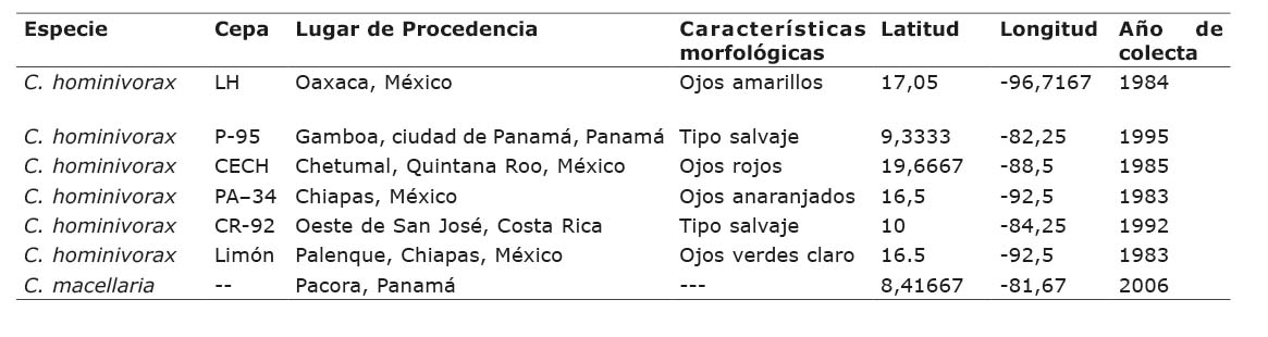 El estudio se realizó durante los años 2006 y 2007, en el Laboratorio de Biología Molecular del Instituto Smithsonian de Investigaciones Tropicales en Panamá. Se utilizaron especímenes de seis cepas de C. hominivorax y la especie C. macellaria. Las cepas de C. hominivorax, se colectaron en México, Costa Rica y Panamá, antes de su erradicación en cada país (en México antes de 1987, en Costa Rica antes de 1995 y Panamá en el año 1995), con estas colectas se estableció el pie de cría por el personal del Servicio de Investigación Agrícola (ARS, por sus siglas en inglés), del Gobierno de Estados Unidos, donde hasta la fecha se mantienen en el Laboratorio de la Comisión Panamá - Estados Unidos para la Erradicación y Prevención del Gusano Barrenador del Ganado (COPEG), en Panamá (Cuadro 1).