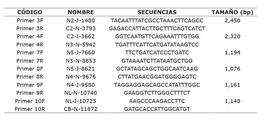 Para la amplificación de la reacción en cadena de la polimerasa (PCR) los cebadores (= primers) fueron apareados y utilizados en la amplificación del mtADN. Los cebadores utilizados y el protocolo de PCR que se estableció como punto de partida para iniciar la investigación fue el propuesto por Malliphan et al. (2006). Fue necesario optimizar los protocolos para cada par de cebadores. Se evaluaron seis pares de cebadores (Cuadro 2).