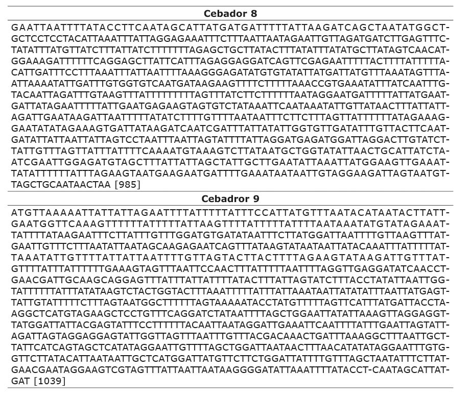 Para la reacción en cadena de la polimerasa en la especie C. macellaria se evaluaron tres pares de cebadores: Primer 7F/7R (N5-J-7660/N5-N-8853), Primer 8F/8R (N5-J-8621/ N4-N-9676) y Primer 9F/9R (N4-J-9580/ NL-N-10740), descritos en la Cuadro 2. Con las regiones amplificadas de cada par de cebadores se realizó la secuenciación en ciclo para obtener las secuencias de cada una de las regiones amplificadas C. hominivorax y C. macellaria.