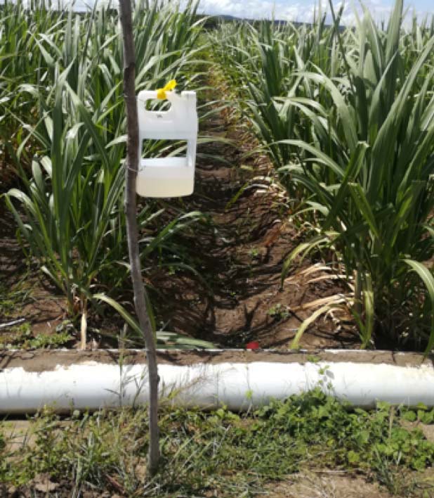 El experimento correspondió a la colocación de trampas, para la captura de machos de polillas, en bordes de un cañal y su evaluación semanal durante todo el desarrollo del cultivo. Cada trampa se elaboró con un recipiente de plástico con capacidad de 3,78 l, en el que se erigieron dos ventanas laterales, y el fondo se llenó con agua jabonosa, la cual fue sustituida cada semana (Figura 1).