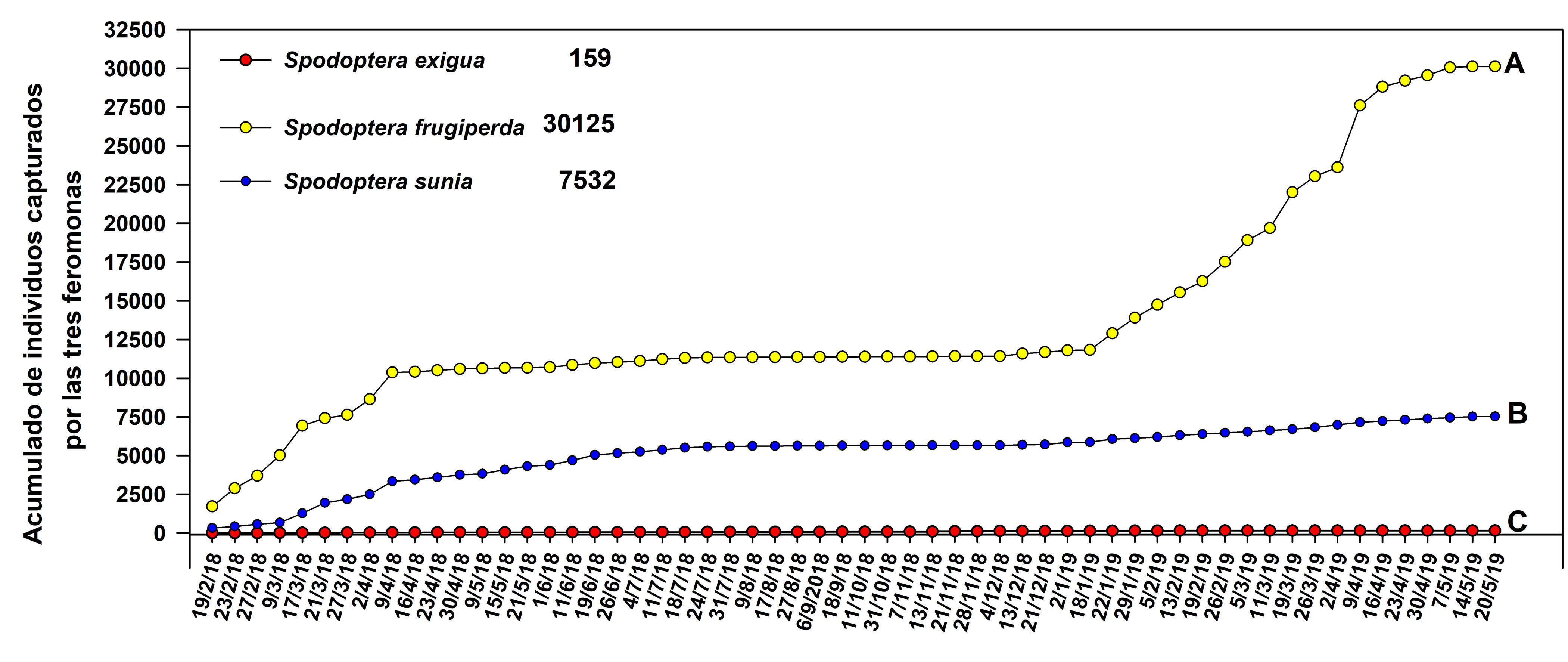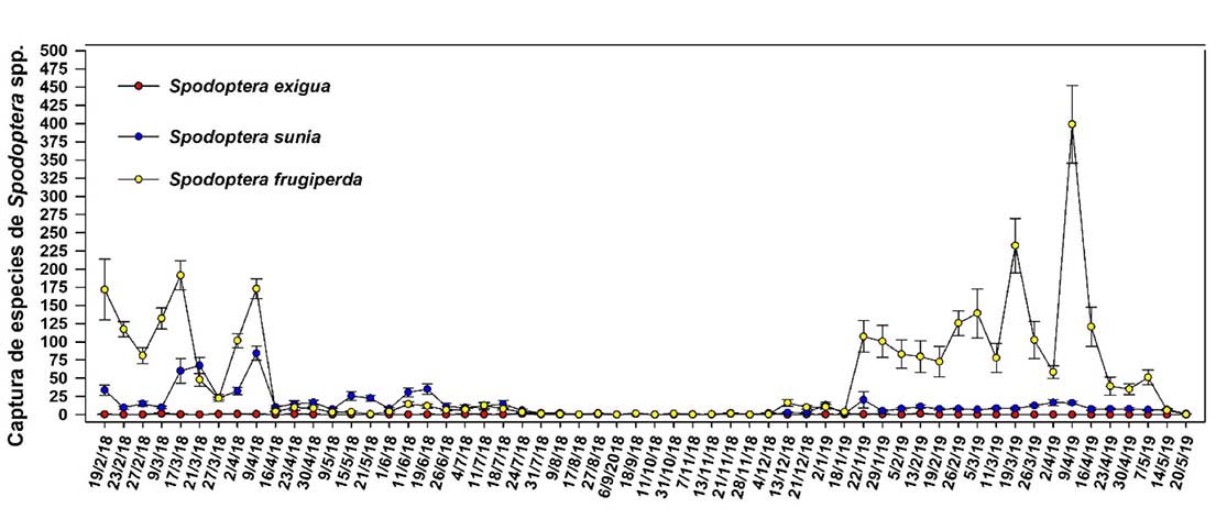 Figure 3. Population dynamics of three species of the Spodoptera genus in a sugarcane plantation. Cañas, Costa Rica. 2018-2019.
