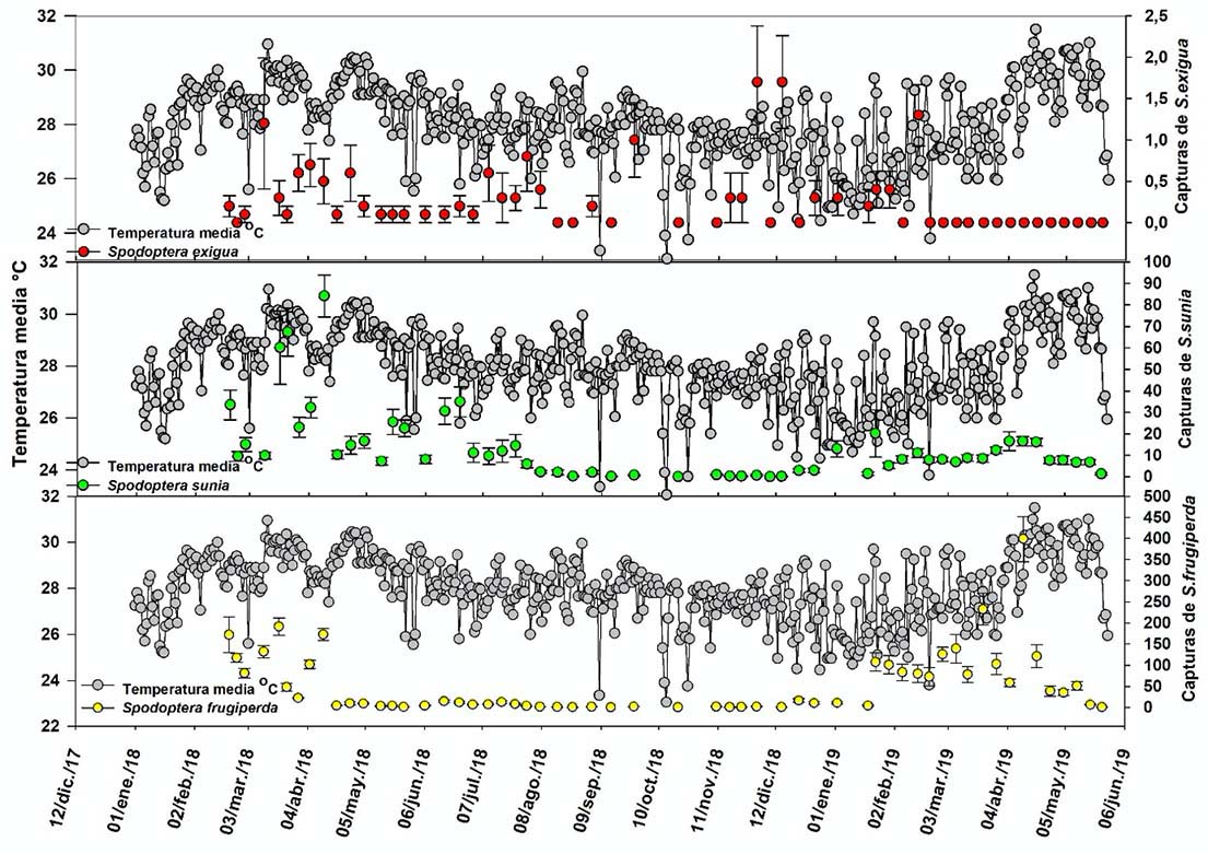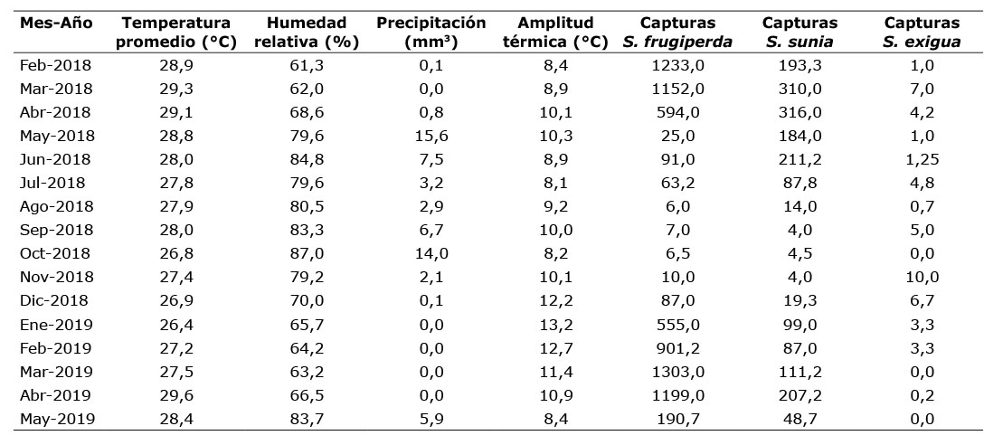Al observar el comportamiento poblacional de las tres especies capturadas durante el 2018 y 2019, el pico poblacional de S. frugiperda estuvo en los primeros cuatro meses del año (enero-abril), mientras que la mayor abundancia de S. sunia se observó entre marzo y junio, y finalmente S. exigua presentó bajas capturas a lo largo de todo el periodo evaluado (Figura 3). Las variables climatológicas mostraron varias tendencias respecto a las capturas de cada una de las especies estudiadas (Cuadro 1).