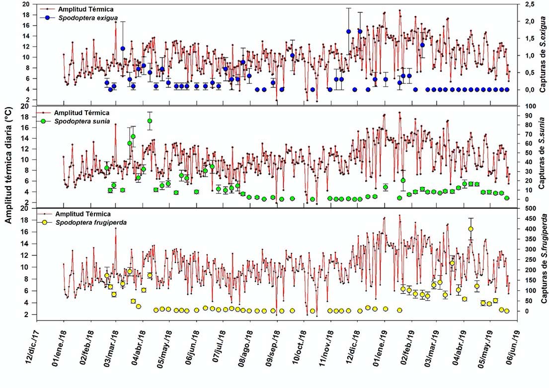 En el caso de S. frugiperda el análisis de regresión múltiple mostró que la temperatura promedio, la amplitud térmica y la humedad relativa fueron factores que afectaron significativamente las capturas de esta especie (ANOVA, F=33,41, p<0,0001), lo cual también se observó en la dinámica de capturas durante el periodo en estudio (Figura 4). Para S. frugiperda el mayor aumento de las poblaciones se dio cuando la amplitud térmica alcanzó el grado de la temperatura más alto (Figura 5), momento en que el ambiente se encontró más caliente, y de este modo propició que se acortara el ciclo de vida del insecto plaga (Durán, comunicación personal, 2019). Si se considera que el ciclo de vida de S. frugiperda se puede completar en 30 días con temperaturas entre 25 y 30 grados, los resultados indican que se podrían observar en campo aproximadamente unas doce generaciones anuales de este insecto. En el caso de S. sunia hubo el mismo comportamiento pero menos marcado, pero es probable observar al menos doce generaciones anuales, porque su ciclo dura 30 días a una temperatura óptima de 26 °C. Para S. exigua, al existir capturas en niveles muy bajos, realmente no es posible correlacionar la temperatura con las poblaciones de machos observados.