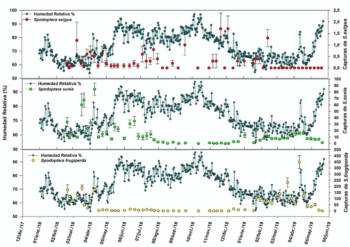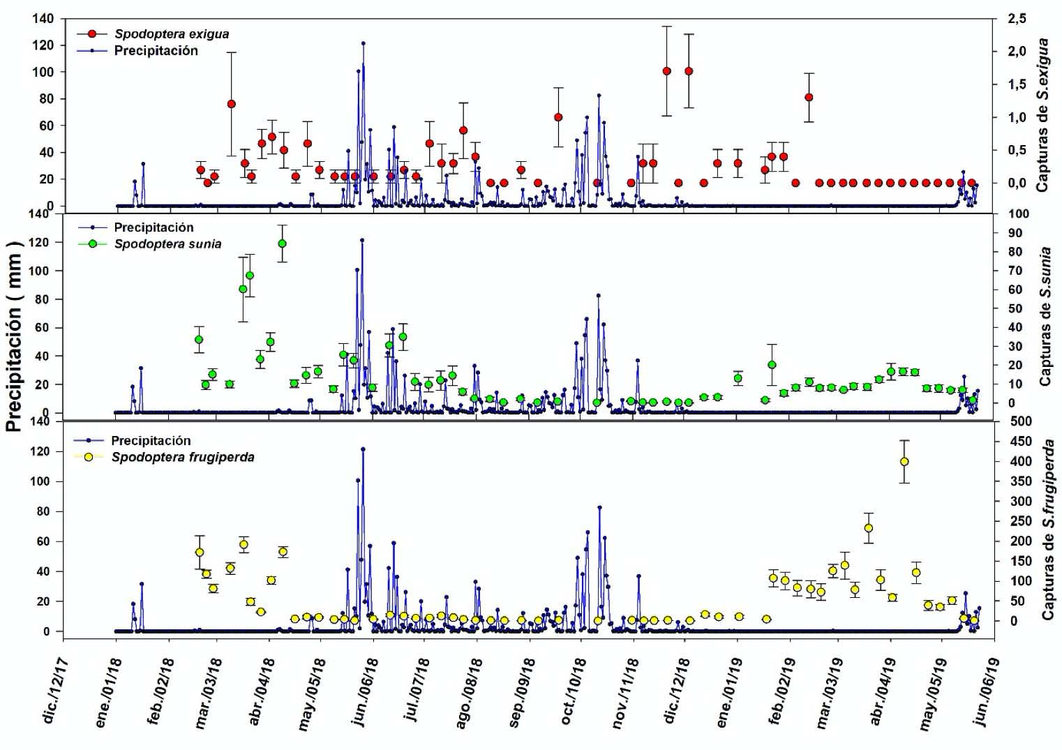 Las capturas de machos de las diferentes especies de Spodoptera, mostraron que S. frugiperda fue la especie más abundante durante los dos periodos secos analizados (febrero-mayo), pero existieron periodos durante el desarrollo de la caña de azúcar en los cuales S. sunia fue más abundante. Estas diferencias estuvieron relacionadas con las variables climatológicas y su efecto en cada especie, periodos secos influyeron en una mayor captura de S. frugiperda, temperaturas más altas se correlacionaron con más altas poblaciones de S. sunia, mientras que la alta precipitación y la alta humedad relativa se correlacionaron con bajas poblaciones de todas las especies en estudio.