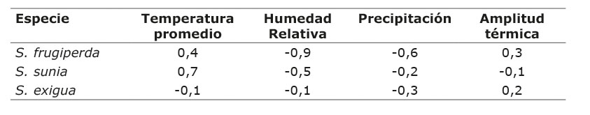 La correlación negativa entre capturas de S. frugiperda y las variables de humedad relativa y precipitación, indicaron que las poblaciones de esta especie disminuyeron en los periodos de más lluvia, mientras que el caso de S. sunia, a pesar que también hubo una correlación negativa con esas variables de clima, no se presentó una disminución tan abrupta en las capturas, debido a que estas fueron bajas. En el caso de S. exigua, todos los factores climatológicos, a excepción de la amplitud térmica, tuvieron una débil correlación negativa, no obstante, las bajas capturas observadas provocaron que estos datos sean difíciles de interpretar (Cuadro 2).