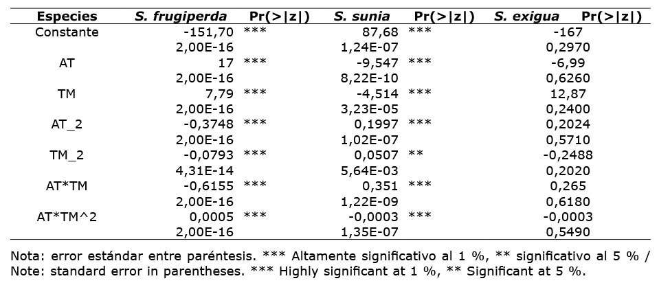 El análisis mediante la prueba del modelo lineal (lm) demostró que, tanto la amplitud térmica (AT) como la temperatura promedio (TM) y sus interacciones fueron significativas en el efecto sobre la captura de machos de Spodoptera spp. Por tanto, se procedió a realizar un análisis por medio del modelo generalizado mixto (glm), con distribución de Poisson para las variables de amplitud térmica (AT) y temperatura media (TM) para las capturas de las tres especies. Para S. frugiperda y S. sunia hubo significancia en todos sus coeficientes, esto describe como estas dos variables climáticas influyeron positivamente en la dinámica o en la presencia de adultos en vuelo, por su parte en S. exigua el total de capturas fue muy bajo, por lo tanto, no correlacionó estadísticamente ni presentó significancia para ninguna variable climática (Cuadro 3).