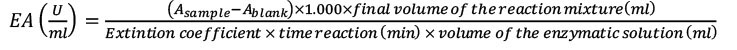 Enzyme activity (EA) was expressed in enzymatic units per milliliter, Asample and Ablank represent the absorbance of the sample and the blank, respectively. The molar extinction coefficient of p-nitroaniline is 8.800 M-1 cm-1 (Erlanger et al., 1961). These assays were performed by triplicate, and the results were reported as means±standard deviations (SD). Controls including 500 µg ml-1 trypsin from porcine pancreas and mixtures of porcine trypsin with 0.12 mmol l-1 SKTI or 0.16 mmol l-1 of the irreversible protease inhibitor phenylmethylsulfonyl fluoride were run in parallel.