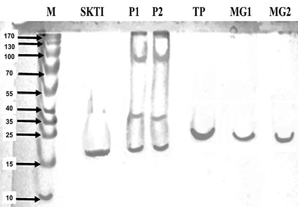 A SDS-PAGE of the soybean meal preparation showed three bands with apparent molecular weights of 92 kDa, 37 kDa, and 20 kDa (Figure 1; lanes PI1 and PI2), while the Kunitz soybean trypsin inhibitor only presented a unique band with apparent molecular weight of 20 kDa (lane SKTI). Additionally, the CBB midgut extract (lanes MG1 and MG2), as well as trypsin from porcine pancreas (TP) generated only one band with an estimated molecular weight of 24 kDa.