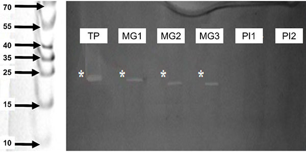 Figura 2. Actividad tríptica detectada en extractos de intestino medio de CBB (Hypothenemus hampei, Ferrari) (MG1-3, kDa) y extractos de intestino medio de broca tratados con un extracto parcialmente purificado de harina de frijol de soya en una proporción 1:1 (PI1-2, kDa). Zimograma de gelatina al 0,1 % (m v-1). TP: tripsina de páncreas porcino utilizada como un control positivo (kDa). Los asteriscos color blanco indican las actividades trípticas de cada muestra, en caso de estar presente. Universidad de Costa Rica, San José, Costa Rica, 2012-2013.