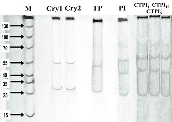 A SDS-PAGE of Bti-sc revealed two bands of 52 kDa and 24 kDa (Figure 3, lanes Cry1, and Cry2), whose protein quantities were estimated to be approximately 7.1×103 and 7.3×103 ng, respectively. These proteins were partially degraded to bands of 50 and 22 kDa when Bti-sc was mixed with dilutions of trypsin from porcine pancreas (lane TP) and the partially purified soybean extract (lanes CTPI1, CTPI5, and CTPI10), lowering their protein quantities to 7.2×103, 5.9×103, and 3.9×103 ng, respectively.