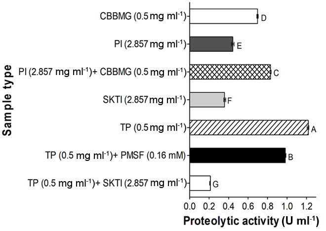 The soybean extract showed 1/3 of the BApNA proteolytic activity measured for trypsin (Figure 4, PI=0.444 U ml-1), and its mean value was similar to that of the Kunitz soybean trypsin inhibitor (SKTI=0.361 U ml-1) but lower than the CBB midgut extract (CBBMG=0.699 U ml-1) and the porcine trypsin (TP=1.218 U ml-1). Furthermore, the soybean extract did not diminish the proteolytic activity of the CBB extract (PI+CBBMG=0.833 U ml-1), while the Kunitz trypsin inhibitor (TP+SKTI=0.210 U ml-1) or a chemical inhibitor (TP+PMSF=0.903 U ml-1) did reduce the proteolysis of porcine trypsin. Altogether, these results confirm that this soybean extract, in addition to its PI activity, contained some level of unexpected protease activity.