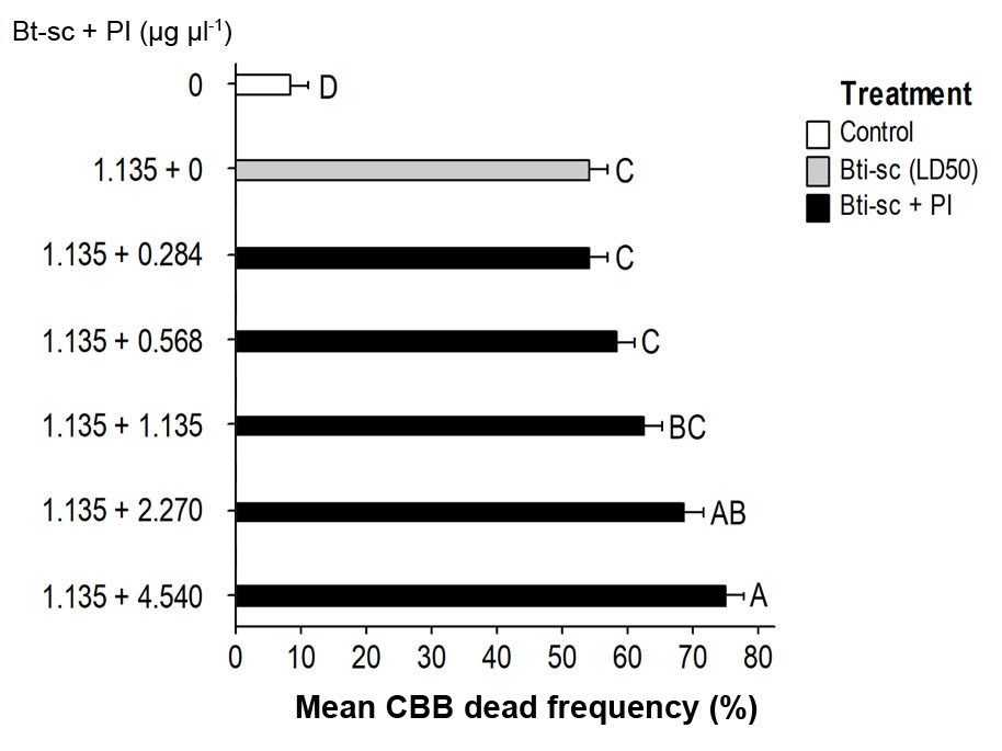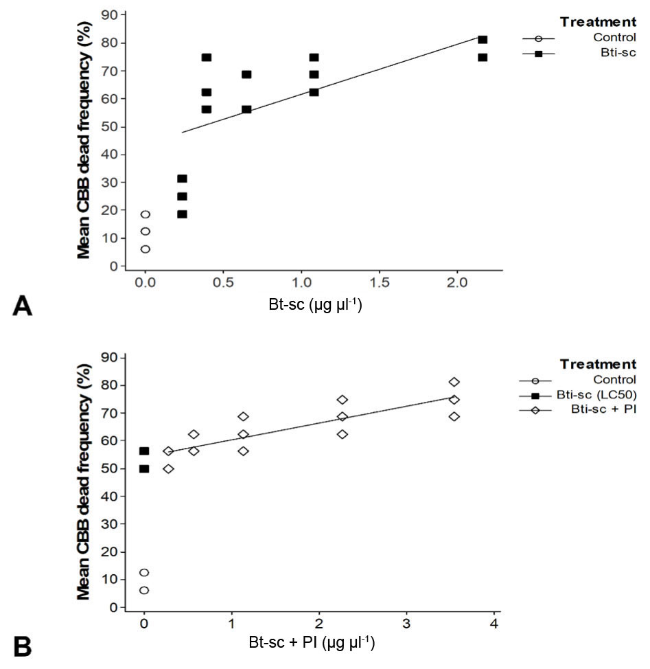 Prior research employing nine B. thuringiensis strains, whose spore-crystal complex (Bt-sc) was purified through differential centrifugation with a NaBr gradient, revealed that only the serovars israelensis and thompsoni caused 100 % mortality against first-instar larvae of CBB and reported a sublethal concentration (LC50) of 0.219 µg µl-1 for Bti (Méndez-López et al., 2003). Although first-instar larvae are likely more susceptible to Bti endotoxins in the present study, a higher LC50 (1.135 µg µl-1) on adult CBB was recorded, even though there is no literature comparing susceptibility among CBB instars. Similarly, the LC50 recorded in this research was about six orders of magnitude higher than the values obtained in a prior study, testing fourth-instar Aedes aegyptii larvae (2.061×10-6 µg µl-1) (Hernández-Soto et al., 2009), probably because dipterans are more susceptible than coleopterans to Bti Cry proteins. Furthermore, previous research has focused on testing only Bt-sc against CBB larval stages (De-la-Rosa et al., 2005; López-Pazos et al., 2009; Zorzetti et al., 2018). Thus, this is the first evaluation of the susceptibility of H. hampei adults to Bt-sc from B. thuringiensis, either alone or mixed with a partially purified plant extract enriched in PI. This finding suggests that Bti-sc could be used as a suitable active ingredient not only for controlling CBB larvae, but also adult insects. This double control effect has been reported for mosquitoes, where the insecticidal activity of Bti-sc kills both larvae and adults, with the adults showing a higher susceptibility to the toxins (Mansour et al., 2012; Zahiri and Mulla, 2005).