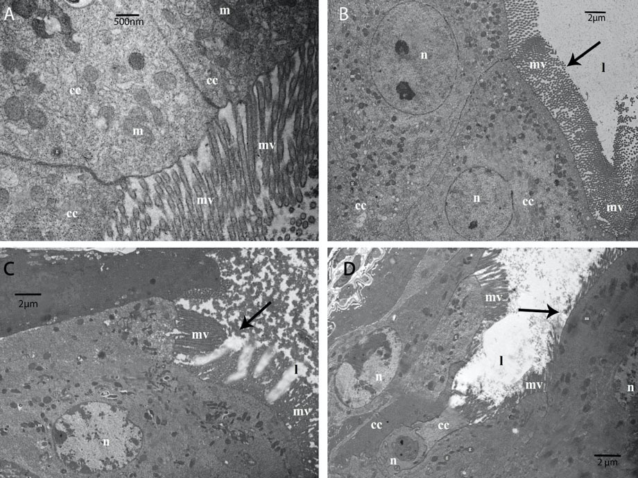 Figura 7. Efectos histológicos de las toxinas de Bti evaluadas solas o en combinación con un extracto parcialmente purificado de G. max contra CBB (Hypothenemus hampei Ferrari). Cortes ultrafinos de secciones de intestinos medios de CBB alimentados con una dieta artificial sola (A, B), dieta suplementada con δ-endotoxinas de Bti a 1,135 µg µl-1 (C), o dieta suplementada con δ-endotoxinas de Bti a 1,135 µg µl-1+extracto de frijol de soya a 4,540 µg µl-1 (D). Las flechas color negro muestran microvellosidades epiteliales (mv) o restos de microvellosidades, los cuales están cerca del lumen (l). Células columnares (cc) conformadas por núcleos (n), gránulos (g) y mitocondrias (m) aparecen inmediatamente bajo dichas estructuras. Universidad de Costa Rica, San José, Costa Rica, 2012-2013.