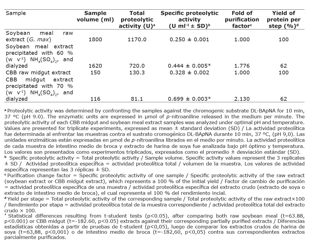 The ammonium sulfate precipitation and dialysis procedures performed resulted in a fold purification factor of the soybean meal extract containing PI of 1.776 and a yield of 64 %, while a CBB midgut extract resulted in a value of 2.130 and a yield of 62 %; compared to their basal raw extracts (Table 1).