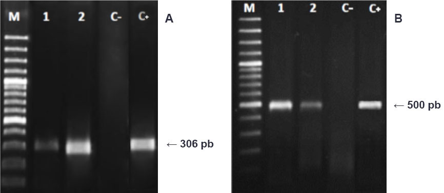 Figura 1. Electroforesis en gel de agarosa que muestra los productos de PCR de los protocolos implementados para el virus del síndrome de la mancha blanca (WSSV) (A) y de Enterocytozoon hepatopenaei (EHP) (B). Costa Rica, 2017-2018.