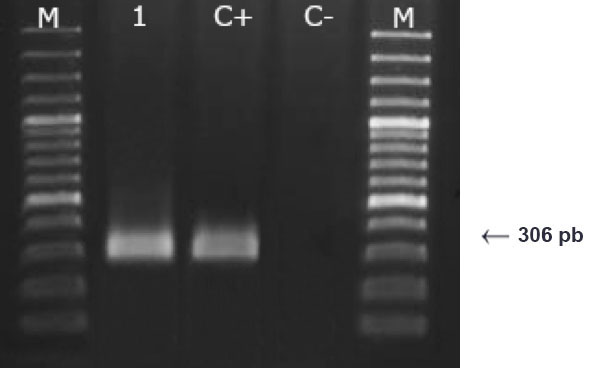 M: marcador de peso molecular de 100 kb. 1: hepatopáncreas de camarón positivo de Costa Rica; C+: control positivo; C-: control negativo.