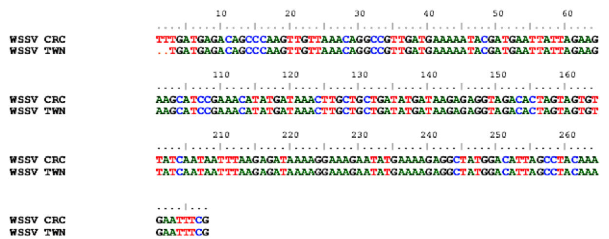 Figura 3. Alineación de la secuencia del virus del síndrome de la mancha blanca (WSSV) aislado de un hepatopáncreas de camarón de Costa Rica (WSSV CRC), en camarones (Penaeus vannamei) de una granja ubicadas en el Golfo de Nicoya, con la secuencia de WSSV aislada de un camarón de Taiwán (WSSV TWN), con base en el programa ClustalW2 y depositadas en el GenBank. 2018.