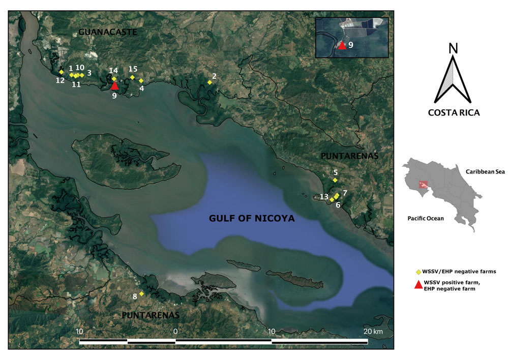 Since 2000, when WSSV was first diagnosed in the country, only passive surveillance has been carried out by the authorities, that is, that diagnosis is only performed on farms where the presence of WSSV is suspected. Also, only few investigations of WSSV and none about EHP have been carried out in Costa Rica. The objective of this work was to detect the presence of WSSV and EHP in fifteen shrimp farms located in the Gulf of Nicoya and Central Pacific from Costa Rica.