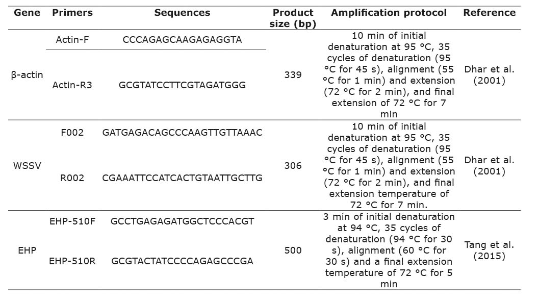 The samples (water, postlarvae, and juvenile shrimp hepatopancreas and stomachs) were analyzed using three PCR protocols (Table 1): in the first PCR the β-actin gene of the shrimp samples (postlarvae, hepatopancreas, and stomachs) was amplified according to the protocol described by Dhar et al. (2001), to confirm the correct extraction of DNA from the samples and discard inhibitions. In the second PCR a segment of the VP41B gene of WSSV was amplified following the protocol described by Dhar et al. (2001), and in the third PCR a segment of the SSU rRNA gene of EHP was amplified according to the protocol described by Tang et al. (2015). The reaction mixture for the PCR included DNA template (0.8-1.6 μM), primers at 10 μM concentration, and 0.6 μM Master Mix (DreamTaq, Thermofisher®), for a final volume of 25 μl. DNA from WSSV and EHP, acquired from the University of Arizona, USA, was used as positive control. Nuclease-free water (Fermentas®) was used as negative control.