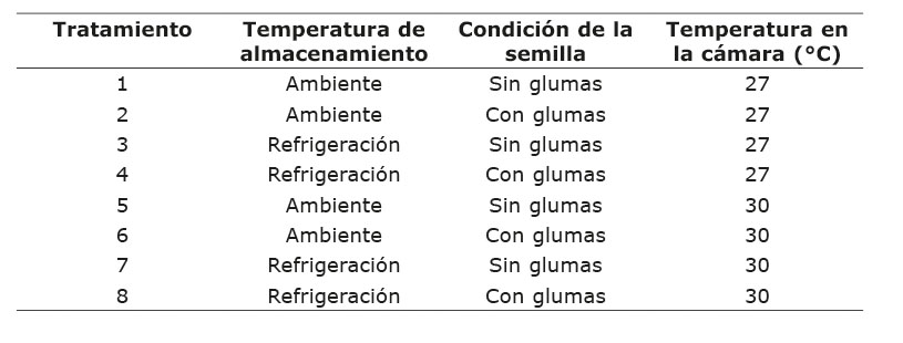 Los tratamientos se distribuyeron al azar, en total se realizaron tres réplicas de cada uno de ellos, con un arreglo factorial que contempló tres factores: la condición de semilla (Cs) (semilla con glumas (CG) y sin glumas (SG)), la condición de almacenamiento (CondAlm) (semillas provenientes de temperatura ambiente (TA) y de temperatura de refrigeración (TR)), y temperatura de la cámara (Tem cam) a 27 °C y a 30 °C (Factor 3) (Cuadro 1). La variable de respuesta fue el número de semillas germinadas por unidad experimental (plato Petri), el conteo se realizó a los 8 y 15 días después de sembradas las semillas (dds). A los 8 días luego de realizar la primera evaluación, se sacaron las plántulas germinadas de sus respectivos platos.