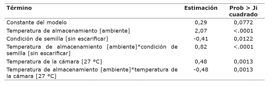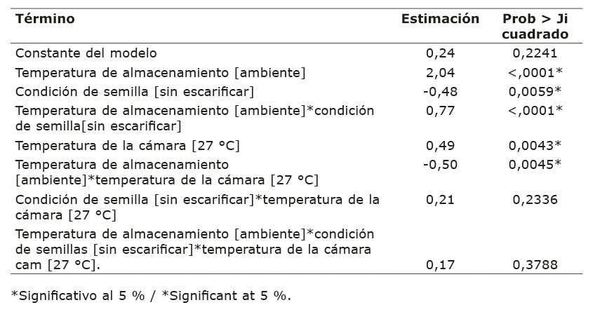 En el Cuadro 2 se puede apreciar que la interacción triple fue no significativa (p= 0,3788), lo mismo que la interacción entre la condición de la semilla y la temperatura de la cámara (p= 0,2112). Por esta razón, se decidió evaluar el modelo suprimiendo estos dos efectos y el resultado se muestra en el Cuadro 3, en el que se observa que todos los efectos son significativos. Procede, entonces, interpretar las interacciones entre la temperatura de almacenamiento y la condición de la semilla, y entre la temperatura de almacenamiento y la temperatura de cámara.