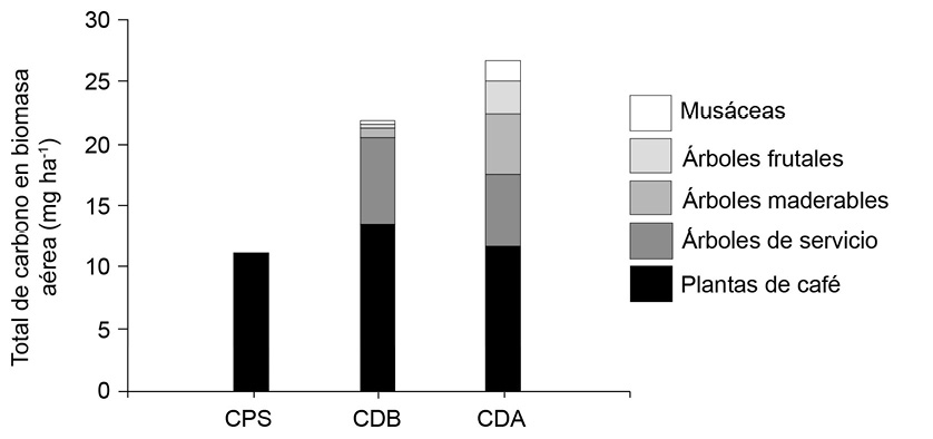 El secuestro de carbono en sistemas agroforestales con café es más intenso que plantaciones en monocultivo (Harmand et al., 2006). Se encontró 29,8 Mg ha-1 más de carbono presente en la biomasa aérea de parcelas de café con árboles de sombra (maderables, frutales y de servicio) y musáceas, en comparación con plantaciones a pleno sol (Pinoargote et al., 2016). Algo similar encontraron Cerda et al. (2016), lo cual se muestra en la Figura 1. Además, la producción incrementada de hojarasca permitió una acumulación más intensa de carbono en el suelo.