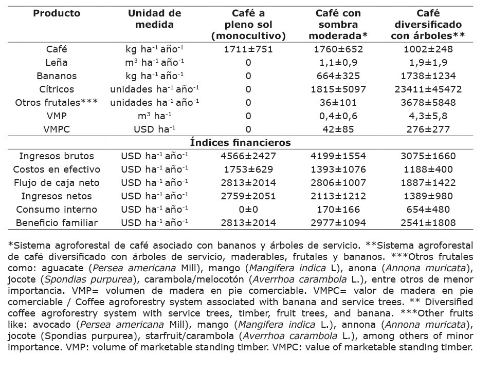 Con respecto a los productos adicionales, estudios recientes (Pinoargote et al., 2016; Cerda et al., 2016), analizaron diferentes sistemas de producción de café: a pleno sol, con sombra moderada (una especie de sombra + especie herbácea) y con sombra diversificada (más de cinco especies). Dichos estudios hacen alusión a los principales productos adicionales brindados por los árboles asociados al café (incluyendo los productos obtenidos de herbáceas), tales como: leña, frutas, madera, banano, plátano, entre otros. Asimismo, se cuantificaron los rendimientos, costos de producción e ingresos de todo el sistema agroforestal, incluyendo el café como cultivo principal, concluyendo que el manejo bajo sombra moderada presenta rendimientos similares (e inclusive mayores en un 3 %) que el café a pleno sol (Pinoargote et al., 2016) (Cuadro 1).