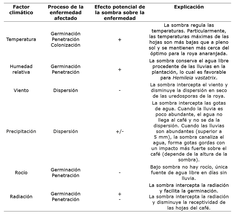En el Cuadro 2 se presenta un resumen de cómo la sombra a través del microclima puede favorecer ciertos procesos del desarrollo de un patógeno y desfavorecer otros procesos de este. Esto ayuda a dar una idea de lo complejo que puede ser analizar estas interacciones (sombra – plagas y patógenos). Se muestra un ejemplo con Hemileia vastatrix, agente causal de la roya del café, aprovechando varios años de seguimiento y de exhaustiva revisión bibliográfica realizada por Avelino y Rivas (2013). Estos efectos complejos de la sombra pueden seguir un patrón similar en otras plagas (broca, minador, etc.) y patógenos causantes de enfermedades como ojo de gallo, antracnosis, entre otras de importancia para la caficultura (Villarreyna-Acuña, 2016a).