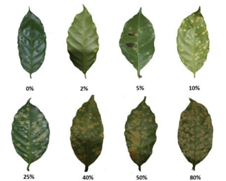 Figura 1. Escala usada para cuantificar la severidad de H. vastatrix en café cv Typica en Chanchamayo, Junín-Perú, de Abril 2017 a Marzo 2018.