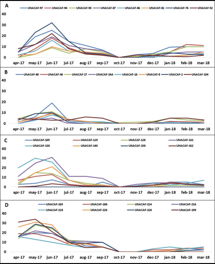 The data of the severity of H. vastatrix in coffee trees cv Typica in Peruvian conditions showed that all genotypes presented different degrees of severity during the course of the experiment (12 months). In general, the lower, middle and upper parts had the highest presence of CLR in April, May, June, July, August, February and March (dry season). Meanwhile, from September to January (rainy season) the severity decreased notably (Figure 2, 3, 4). Within the dry season, the presence of H. vastatrix increased significantly in May and June, although its presence depended on the part of the plant where the measurement was made and the genotype evaluated. In the lower, middle and upper part of the plant, severity reached 32 to 34 %, 20 to 30 %, and 12 to 23 %, respectively. In addition, only in May, UNACAF-199 showed the highest severity values in all parts of the tested plant, for example in the lower, middle and upper section it had 34 %, 30 %, and 23 % (Figure 2-D; Figure 3-D and Figure 4-D).