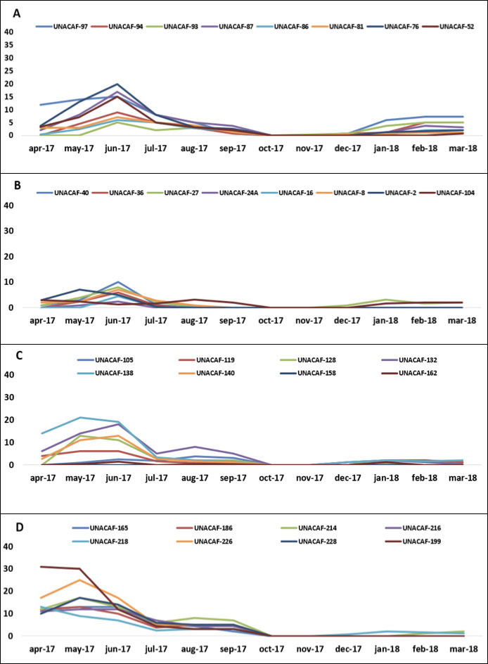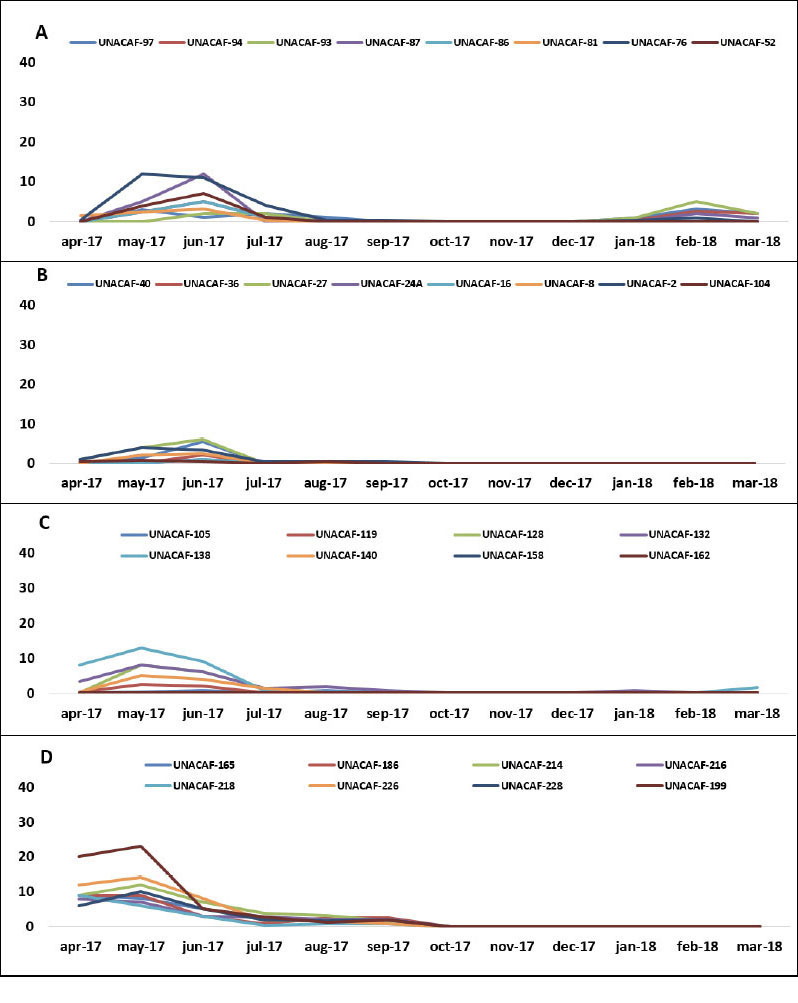 Abstract: Introduction. Coffee (Coffea arabica L.) is an important crop in producing countries like Peru, where approximately two million families depend on its production, distribution, and marketing. But in recent years, climate change has increased the presence of coffee leaf rust - CLR (H. vastatrix), a disease that has decreased Peruvian production by up to 27%. Objective. Monitor the severity of CLR in different genotypes of coffee cv. Typica from April-2017 to March-2018. Material and methods. The experiment was carried out in the coffee germplasm bank at the Development Regional Institute (IRD)-Selva of the Universidad Nacional Agraria La Molina. The severity and the area under the disease progress curve (AUDPC) in the lower, middle, and upper part of coffee trees were quantified. Result. There was high severity and AUDPC in the dry season (low precipitation) compared to the rainy season (high precipitation). Severity and AUDPC gradually decreased from the bottom to the top of the plant (lower>middle>upper). Also, UNACAF-24A, UNACAF-16, UNACAF-158, and UNACAF-162 genotypes stood out by showing lowest severity (0-1.1 %) and AUDPC (0-714) in the experiment. Conclusion. In this experiment, the genotypes in dry season presented high peaks of severity and UDPC of CLR, meanwhile, in rainy season the presence of CLR was lower. However, in both seasons, severity and AUDPC gradually decreased from the lower third to the upper thirf of the plant. Finally, UNACAF-24A, UNACAF-16, UNACAF-158, and UNACAF-162 presented the lowest degrees of severity of CLR.