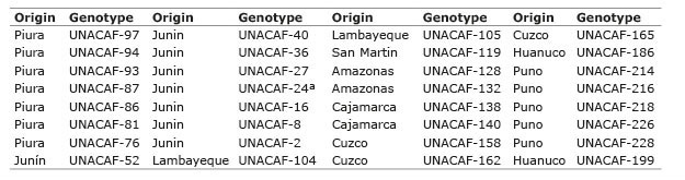 Tabla 1. Accesiones estudiadas en la cuantificación de la severidad de H. vastatrix en café cv Typica, en Chanchamayo, Junín-Perú, de Abril 2017 a Marzo 2018.