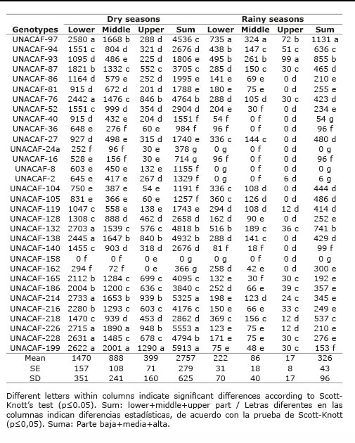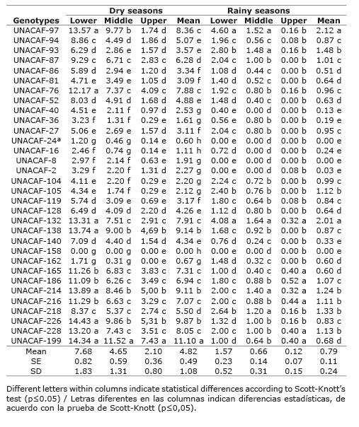 The data of the area under the disease progression curve (AUDPC) showed that in the dry season, the lower, middle and upper parts of the plant reached values of 2442 to 2715, 1 890 to 2001, and 1290, respectively (Table 3). When the entire plant was examined, the result showed that UNACAF-99 (5913), UNACAF-226 (5553) and UNACAF-214 (5324) had the highest AUDPC values, while UNACAF-24A (378), UNACAF-16 (714), UNACAF-162 (366), and UNACAF-158 (0) were the lowest. In addition, in the rainy season the lower, middle and upper parts of the plant reached AUDPC values of 735, 324, and 99. When the AUDPC values found at the lower, middle and upper parts were added together, the data showed that UNACAF-97 (1131) had the highest severity value.