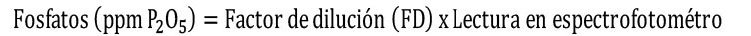 La medición de los fosfatos en panela o ANC se obtuvo a través del método colorimétrico 4 500-P E (Eaton et al., 2005). Para el análisis se pesaron 5 g de panela o ANC y se llevaron a un volumen con agua destilada de 100 ml (dilución 1:20 p/v), a continuación se prepararon dos soluciones, la solución A, compuesta por molibdato de amonio, tartrato de antimonio y potasio, y ácido sulfúrico, y B que era una solución de ácido ascórbico; con ambas se preparó la solución de trabajo, con 45 ml de la solución A y 800 ml de agua destilada, se mezcló hasta homogenizar y se agregó 18 ml de la solución B, aforando hasta 1 litro con agua destilada; luego de la dilución de la muestra, se tomó 1 ml y se agregaron 9 ml de la solución de trabajo (solución A + solución B), se dejó en reposo por 15 min para que desarrollara el color y se realizó la lectura en el espectrofotómetro a 670 nm, se empleó como referencia agua destilada; previamente se debió montar la curva patrón con mínimo cinco puntos de concentración, utilizando dihidrógeno fosfato de potasio (KH2PO4); para el cálculo se utilizó la ecuación 6 y los resultados se reportaron en partes por millón (ppm) de P2O5.