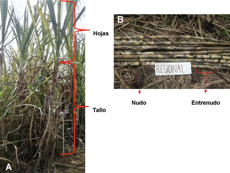 Figure 1. Variety of sugarcane for Canal Point panela (CP 782018). A. Aerial parts (stem and leaves. B. Parts of the stem in sugarcane (internode and knot). Nariño, Colombia. 2008-2009.