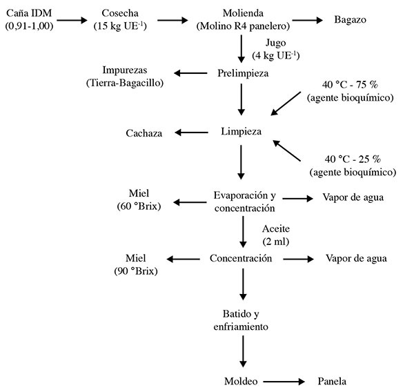 Para la determinación de esta variable se efectuó la molienda experimental, la cual consistió en la transformación de caña a panela o ANC, con el procedimiento descrito por Guaman et al. (2009), en el cual una vez que las unidades experimentales en conjunto alcanzaron el IDM (valor comprendido entre 0,91 y 1,00), se realizó la cosecha, y se colectó aproximadamente 15 kg de caña por cada UE, debidamente identificadas; seguidamente se transportó de campo al trapiche para continuar el proceso poscosecha. Previo al proceso de extracción del jugo se realizó el pesaje de la caña colectada en campo de manera individual para determinar el valor exacto de la caña por cada UE, posteriormente se extrajo el jugo de la caña a través del molino (R14 El Panelero de 2,0 t caña ha-1), de la totalidad obtenida se extrajeron 4 kg de jugo, enseguida se pasaron a recipientes metálicos debidamente tarados, e inició el calentamiento del jugo (que comprende desde jugo crudo hasta la obtención de miel) y los siguientes procesos para transformación (Figura 2).