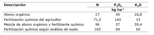 Las fuentes y nutrientes por tratamiento, según análisis de suelo (Cuadro 2), fueron las siguientes: para los tratamientos fertilización química del agricultor se utilizaron 550 kg ha-1 de un fertilizante compuesto con la fórmula (13-26-6), que es la fuente y cantidad que usualmente utilizan los agricultores de la zona; para los tratamientos fertilización química según análisis de suelo se utilizó urea (46-0-0), fosfato diamónico (18-46-0) y cloruro de potasio (0-0-60); en los tratamientos con abono orgánico se utilizaron 1500 kg ha-1 de un fertilizante orgánico con contenido de nitrógeno (1,8 %), fósforo (P2O5) (3,0 %), potasio (K2O) (1,25 %), carbono orgánico (18,1 %), cenizas (41,1 %) y relación C/N (10 %) (Cuadro 3). Para los tratamientos de mezcla fertilización química y abono orgánico las dosis correspondieron al 50 % de las cantidades de los tratamientos individuales, teniendo en cuenta que cuando el productor utiliza abono orgánico disminuye la cantidad de fertilizante químico.