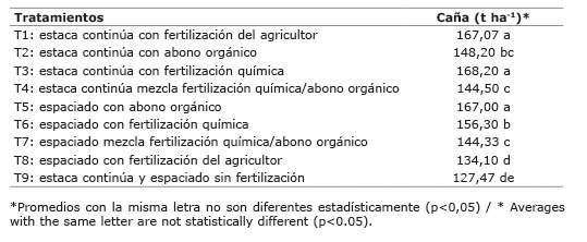 El uso de abono orgánico y la fertilización mineral tuvo un efecto significativo sobre el rendimiento de caña (p<0,05), los tratamientos (T3) estaca continua con fertilización química con 168,20 TCH (T1) estaca continua con fertilización del agricultor con 167,07 TCH y (T5) espaciado con abono orgánico con 167 TCH presentaron el mayor rendimiento de caña con respecto a los demás tratamientos, y fueron significativamente diferentes con respecto al tratamiento (T9) estaca continua y espaciado sin fertilización con 127,47. Los tratamientos de menor rendimiento fueron los que correspondieron (T8) al sistema de siembra espaciado con fertilización del agricultor con 134,1 TCH y el testigo (T9) con 127,47 TCH, en tanto a los tratamientos que combinaron el sistema de siembra espaciado y los sistemas de fertilización, los mayores rendimientos de caña se obtuvieron con abono orgánico (T5) y fertilización química (T6) con 167 y 156 TCH, respectivamente (Cuadro 4).