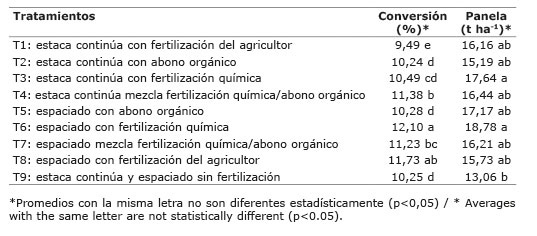 Table 5. Differences between organic and chemical fertilization treatments, for conversion to panela or non-centrifugal sugar (%) and sugarcane yield (Saccharum officinarum L.) (t ha-1) in the municipality of Consacá. Nariño, Colombia. 2008-2010.