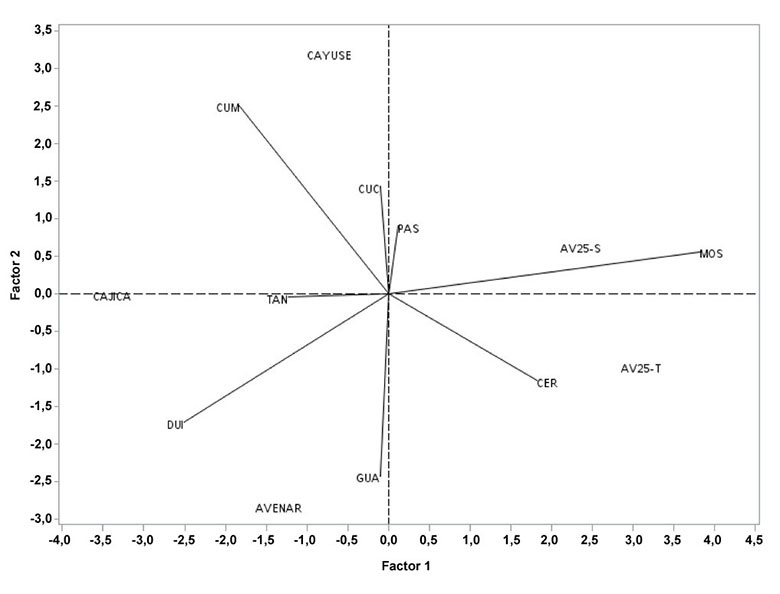 La adaptación específica se observó en AV25-T y AV25-S asociado con las localidades PAS, MOS y CER; Avenar con DUI y GUA; Cajicá con CUM, DUI y TAN y Cayuse con CUM. En relación con la potencia para estratificación del RFV en t ha-1 por su mayor longitud del vector fueron MOS, CUM y DUI, con valores desde 47,8 a 92,5, y la menor potencia de estratificación PAS con valores de 36,5 a 63,5 (Figura 1). Las localidades MOS y CER presentaron RFV de 83,0 para CER y 74,0 para MOS, sin diferir estadísticamente entre sí y diferente estadísticamente con las otras localidades (Cuadro 10). Por su alto rendimiento y mayor longitud del vector estas dos localidades se constituyeron en los mejores ambientes de selección para el programa de mejoramiento genético de avena forraje para AGROSAVIA en Colombia.
