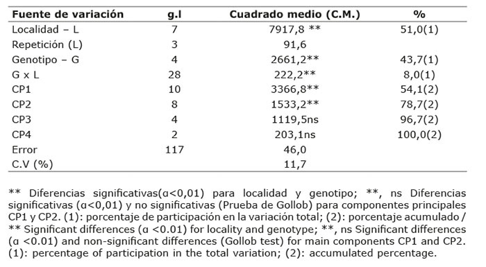 De acuerdo con el análisis de varianza combinado a través de localidades para rendimiento de forraje verde (RFV), se presentaron diferencias significativas para localidad, genotipo e interacción genotipo x localidad. La mayor participación de la variación total del RFV se debió a los componentes de localidad y genotipo, con un valor de 51,0 % y 43,7 %, respectivamente, y la menor participación a la interacción genotipo x localidad (8,0 %). Con base en el análisis AMMI, se estableció mediante la prueba de Gollob (1968), que los dos primeros componentes principales, con una significancia de α<0,01, explicaron el 78,7 % de la interacción genotipo x localidad (Cuadro 9). Este resultado permite una interpretación confiable del comportamiento de la interacción genotipo x localidad, ya que un valor aceptable es una proporción mayor a 75 % (Crossa et al., 2002). El coeficiente de variación observado fue de 11,7 %, el cual es considerado aceptable. La mayor participación del factor localidad en la variación total del modelo estadístico para RFV se debió posiblemente al déficit de agua observado en dos de las ocho localidades del estudio (TAN y DUI) que no lograron satisfacer el 100 % del requerimiento de agua.