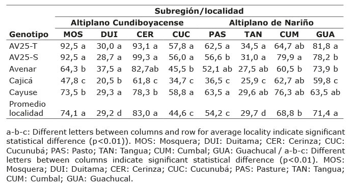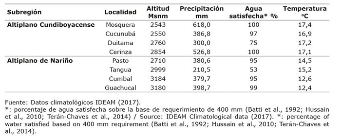 Las localidades se ubicaron en altitudes entre 2543 a 2760 m, con una temperatura media anual entre 16,9 a 17,4 oC, en la subregión altiplano Cundiboyacense y de 2710 a 3184 m con una temperatura media anual entre 12,6 a 14,5 °C en el altiplano de Nariño. Con base en estas dos variables de clima y según la clasificación Caldad-Lang (Gutiérrez, 1991), todas las localidades se clasificaron como Fsh (clima frío semihúmedo) con excepción de CUM que se clasificó como Mfh (clima muy frío húmedo). La principal diferencia entre localidades, en relación con el clima, desde germinación hasta la cosecha de forraje verde, fue la precipitación. De acuerdo con el requerimiento de 400 mm para la producción de 60 a 80 t ha-1 de forraje verde en avena (Bhatti et al., 1992; Hussain et al., 2010; Terán-Chaves et al., 2014), seis de las ocho localidades MOS, CUC, CER, PAS, CUM y GUA se satisfizo el agua requerida en el 100 % o muy cercana al 100 % y en dos localidades DUI y TAN presentaron déficit de agua del 25 % y 43 %, respectivamente, siendo más severa en la última localidad (Cuadro 1).