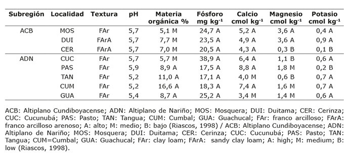 Para conocer el nivel de fertilidad del suelo y la recomendación de correctivos y de fertilización, en cada localidad se tomaron muestras de suelo a una profundidad de 0 a 20 cm, que permitió determinar las características físicas: textura (método del hidrómetro o Bouyoucos) y químicas: pH (método potenciómetro), materia orgánica (%) (método de Walkley y Black), fósforo (mg kg-1) (método Bray II), calcio (Ca), magnesio (Mg) y potasio (K), expresados en (cmol kg-1) (extracción con acetato de amonio pH 7 y cuantificación por absorción atómica). Estos análisis se realizaron en el laboratorio de química de suelos, aguas y plantas de AGROSAVIA con la Norma Técnica de Calidad NTC-2005.