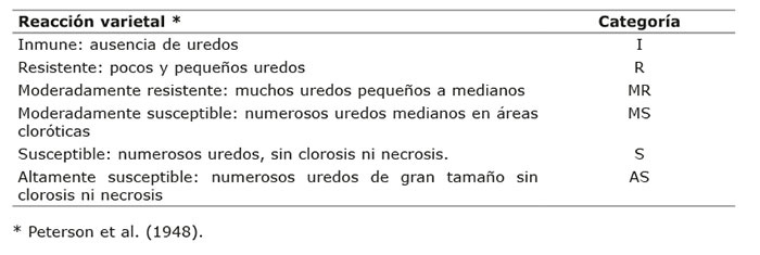 El rendimiento de forraje verde (RFV) se determinó en el estado de grano lechoso (Z-7,0) y expresada en t ha-1, con la cosecha de 15 m2 en cada unidad experimental. En relación con la roya de la hoja (Puccinia coronata f. sp avenae) y la roya del tallo (Puccinia graminis f. sp avenae Erikss y Henning) fueron evaluadas en la etapa grano en la zona central, extendidos 20 % (Z-7,02) en una muestra de 50 plantas al azar. La roya de la hoja se terminó en el tercio superior de la planta y la roya del tallo, en los tallos. Se utilizó, para ambos patógenos, la escala propuesta por Peterson et al. (1948), donde se combina la severidad del área foliar afectada en porcentaje entre 0 y 100 y la reacción varietal (Cuadro 3).