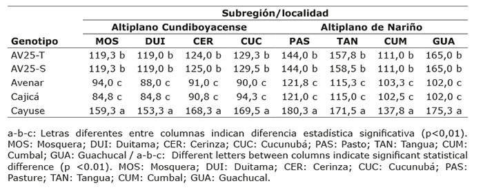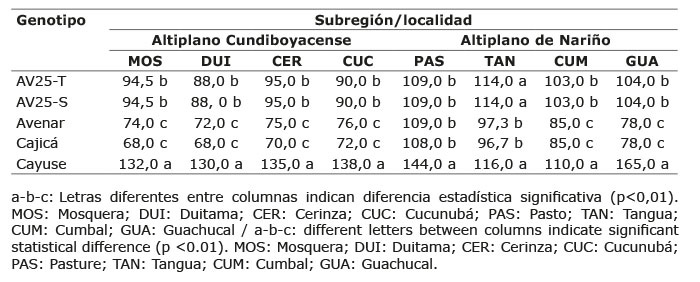 Los días a cosecha de forraje verde de avena (DCFV) presentaron diferencias altamente significativas (p<0,01) para los cinco genotipos en todas las localidades. Los genotipos AV25-S y AV25-T en cada localidad presentaron promedios iguales estadísticamente (p<0,01) entre sí, pero diferentes (p<0,05) a los tres testigos comerciales en todas las localidades, con valores de DCFV entre 111 a 165 días. Los testigos comerciales Avenar y Cajicá no presentaron diferencias estadísticas (p<0,01) en todas las localidades y mostraron valores de DCFV entre 88 a 121,8. La variedad Cayuse fue el testigo comercial que presentó una cosecha de forraje en verde más tardía, diferente estadísticamente (p<0,01) a los demás genotipos en todas las localidades con valores de DCFV entre 137,8 y 180,3 (Cuadro 5).
