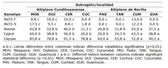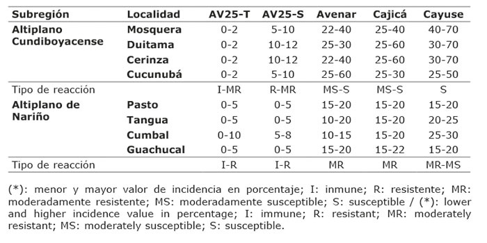 En relación con la roya del tallo (RT), en el altiplano Cundiboyacense y en el altiplano de Nariño los genotipos AV25-T y AV25-S presentaron valores de incidencia que no superaron el 12 %, con una reacción desde tipo inmune hasta moderadamente resistente. Avenar y Cajicá presentaron valores desde 22 % a 60 % en el altiplano Cundiboyacense y de 10 % a 22 % en el altiplano de Nariño, con una reacción moderadamente susceptible a susceptible en la primera subregión y de moderadamente resistente en la segunda subregión. La variedad Cayuse presentó los mayores valores de incidencia en ambas subregiones (25 % a 70 % en el altiplano Cundiboyacense y de 15 % a 30 % en el altiplano de Nariño), con una reacción susceptible para la primera subregión y de moderadamente resistente a moderadamente susceptible en la segunda subregión (Cuadro 8).